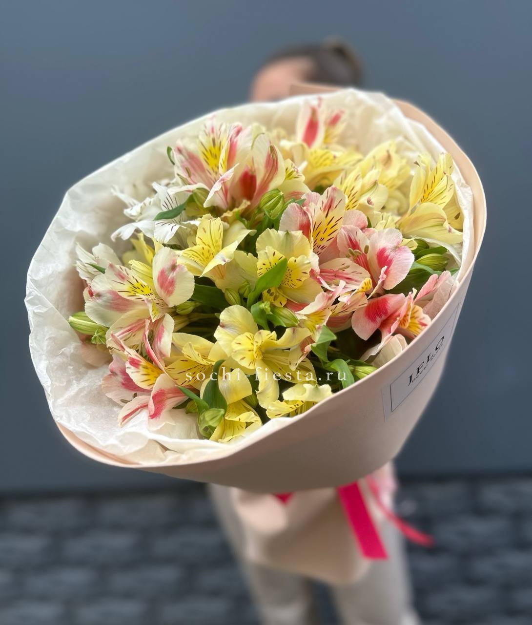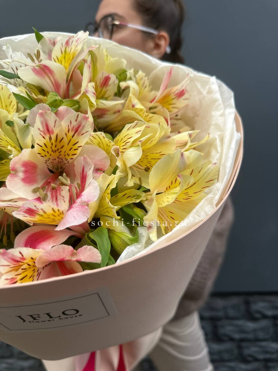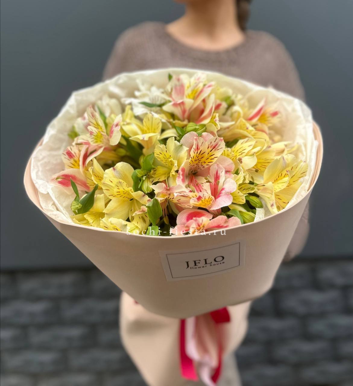 Состав: альстромерия - 9 шт., упаковка, лента.