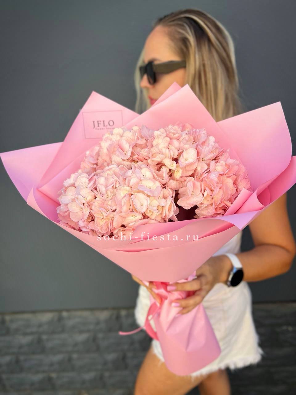 Состав на фото: гортензия - 3 шт., лента, дизайнерская упаковка