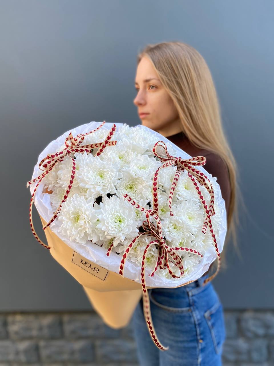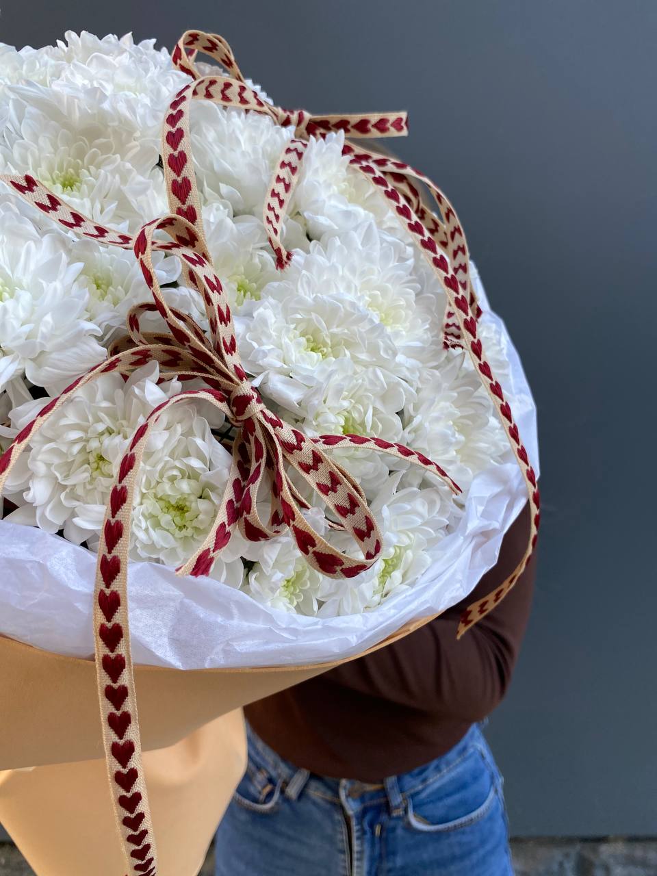 Fifteen веток кустовой хризантемы образуют пышное облако из множества мелких бутонов. Простая упаковка не отвлекает от густоты соцветий и их природной фактуры. Букет долго сохраняет свежесть и объём.