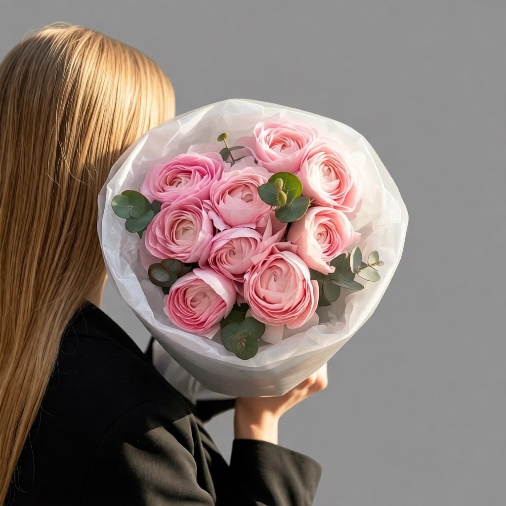 ранункулюсы с эвкалиптом в оформлении. Цвет можно согласовать с менеджером.