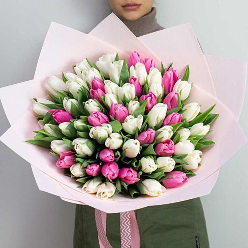 Состав: тюльпан 61 шт., лента, дизайнерская бумага