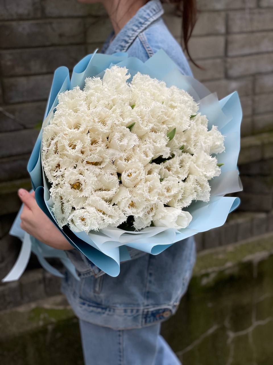Тридцать пять белоснежных махровых бутонов собраны в плотную округлую форму. Многослойные лепестки создают объёмную текстуру и играют светом на каждом ярусе.