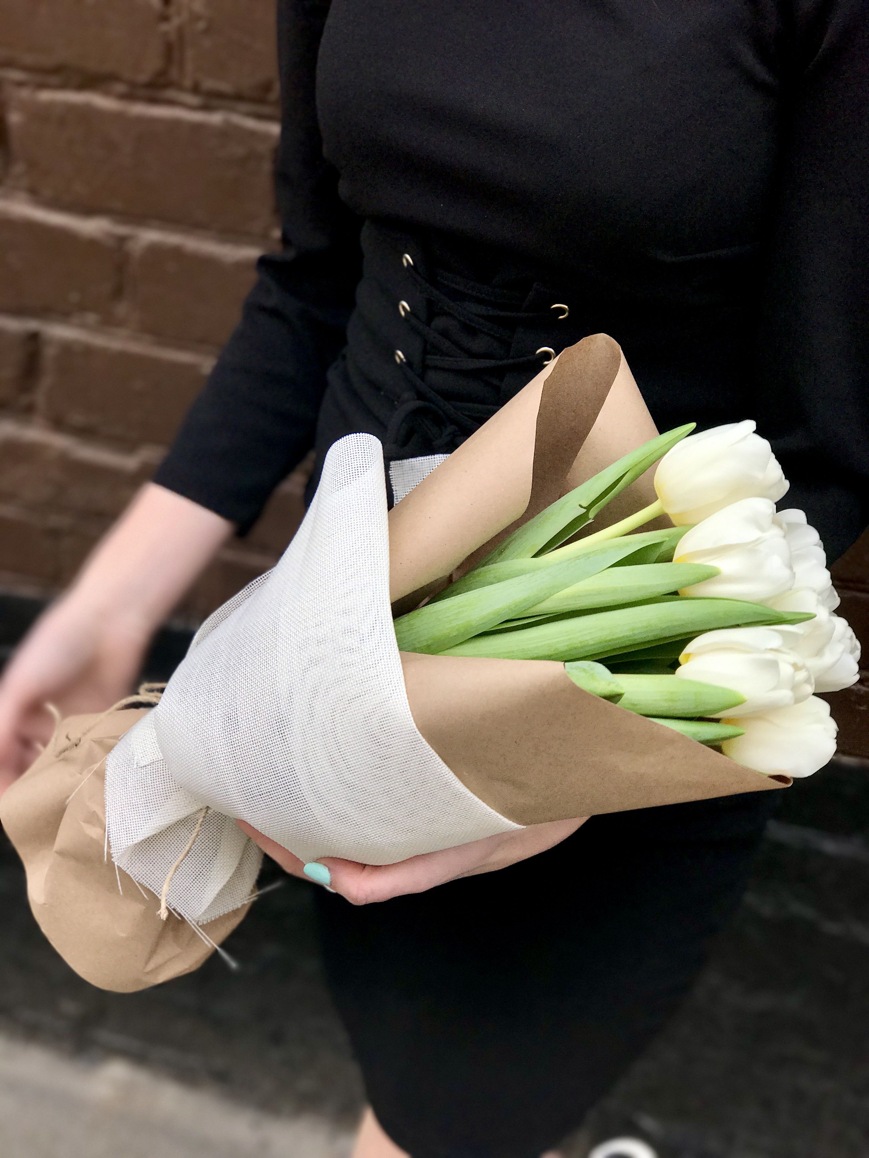 Состав: 7 белых тюльпанов, лента, крафт, вспомогательное оформление