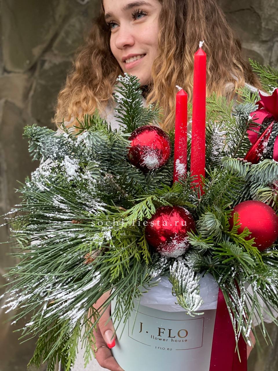 Состав: живая ель (датский нобилис), новогодние игрушки, свечи, декор, оазис, бокс D16см, ленты, тишью