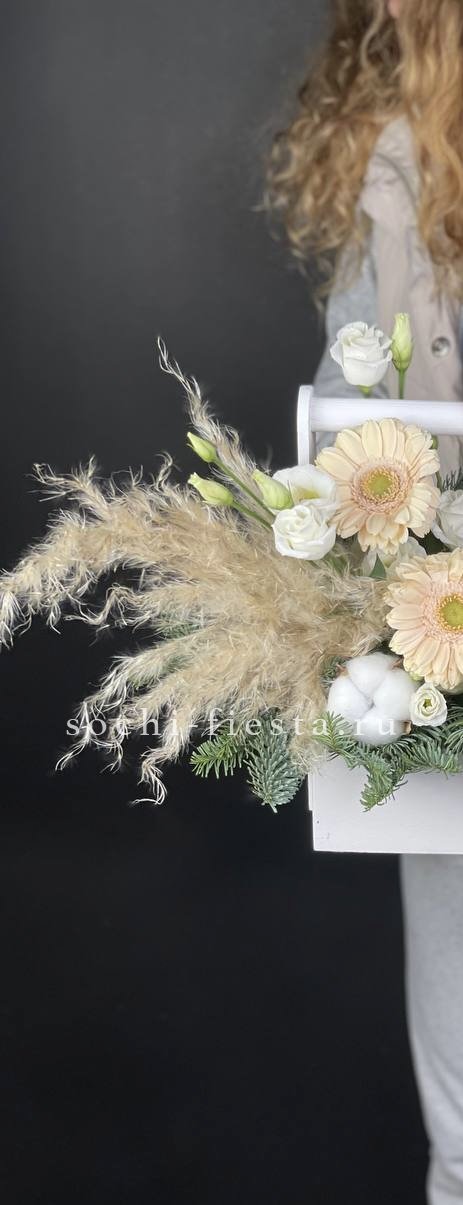 датский нобилис, герберы, эустома, хлопок, сухоцвет, кашпо, оазис, лента ВНИМАНИЕ! Готовая композиция (декор) может иметь незначительные внешние отличия от примера на фотографии.