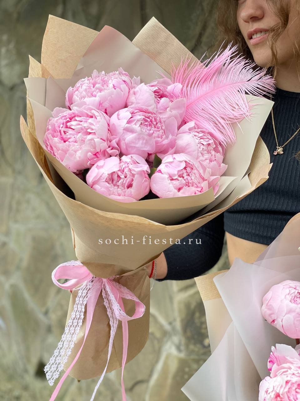 Состав: 7 розовых пионов сорта Сара бернар, лента, дизайнерская упаковка