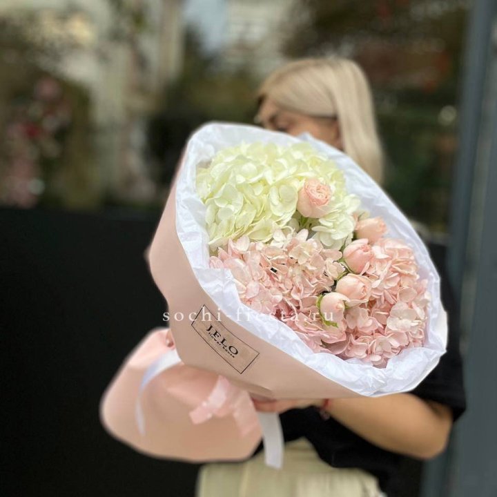 Букет с гортензией и белыми французскими розами