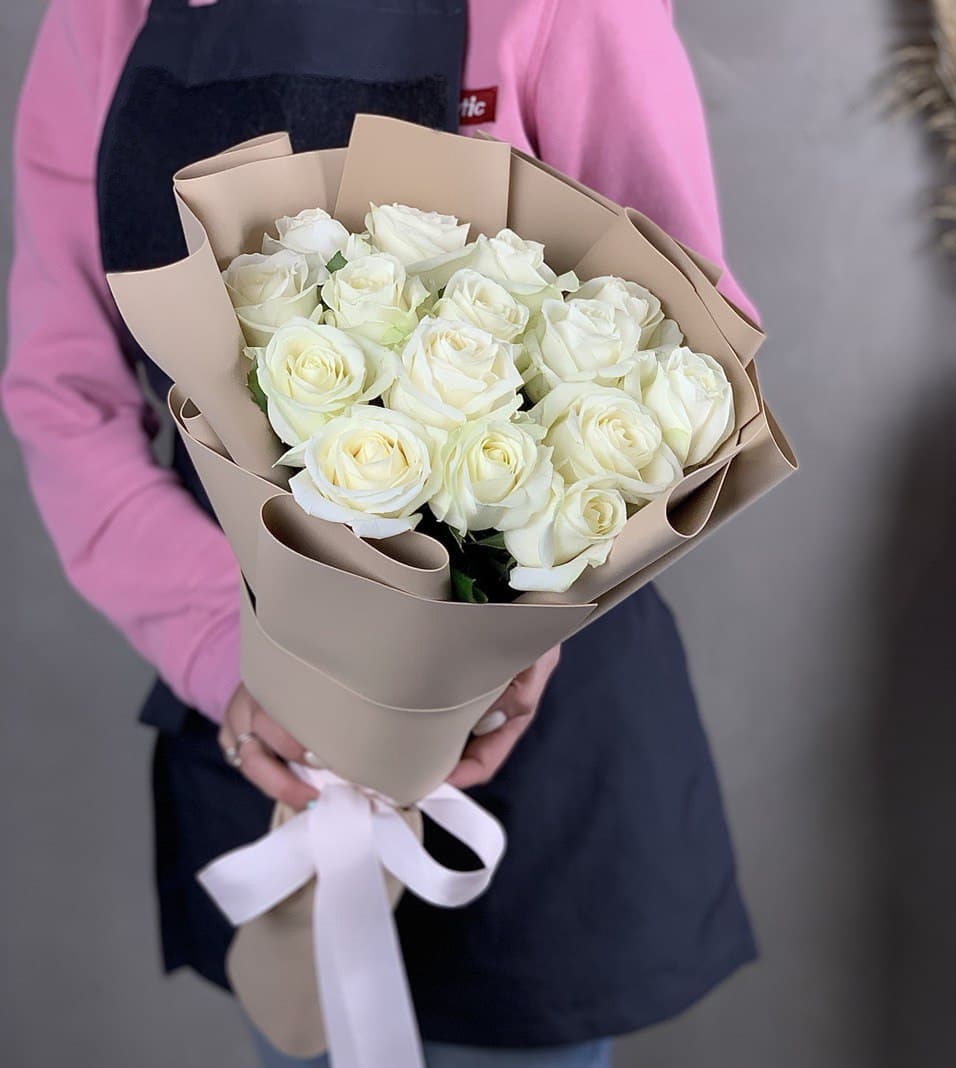Классический букет из пятнадцати белых роз в упаковке из фоамирана держит форму и остается свежим долгое время. Компактная композиция удобна для транспортировки и размещения в любом интерьере.