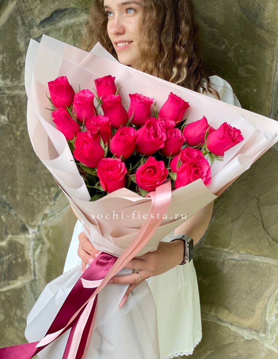 Состав: 19 алых роз, лента, оформление