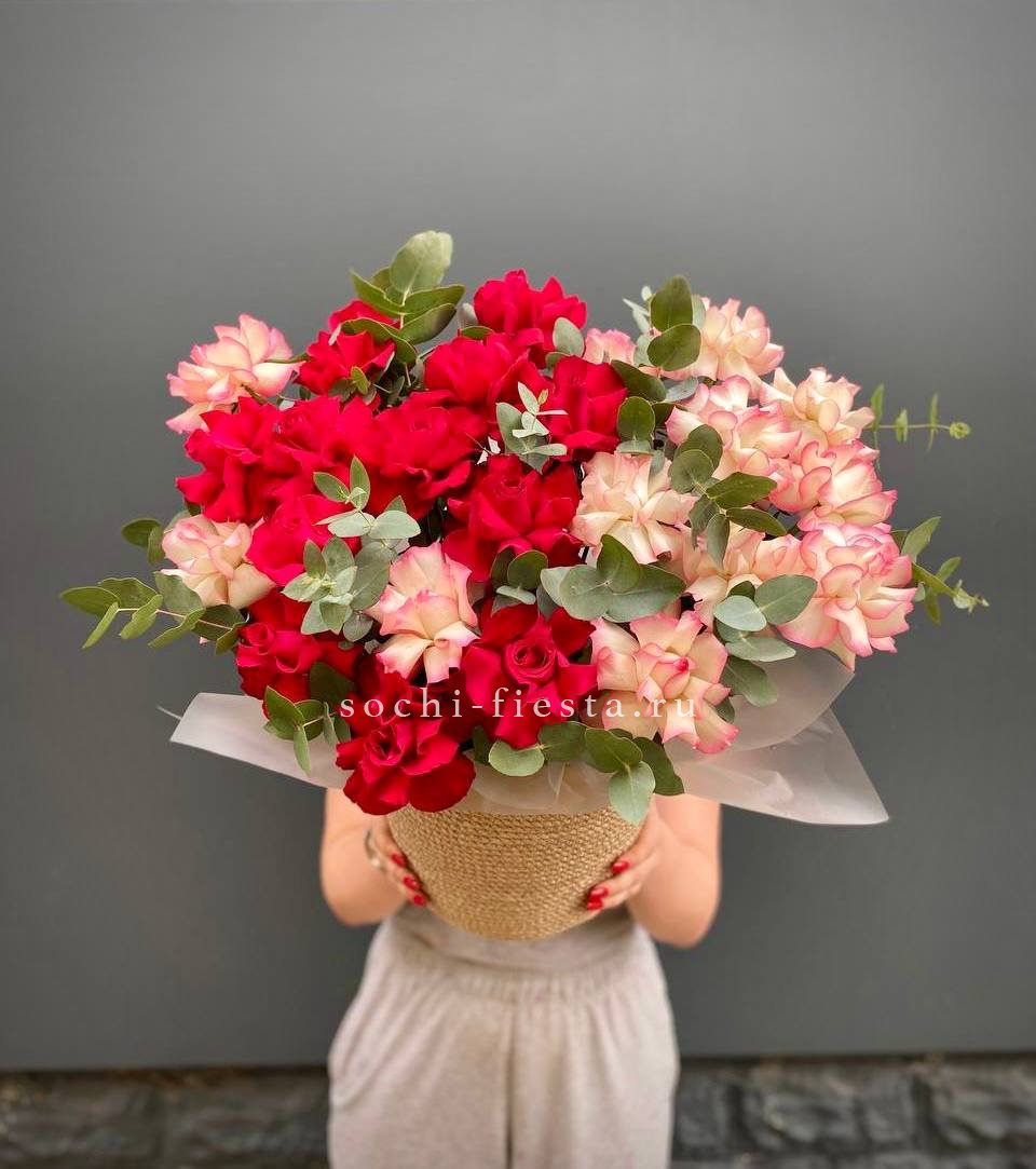 в одной корзине 25 французских роз. На фото сет из 5 корзин.