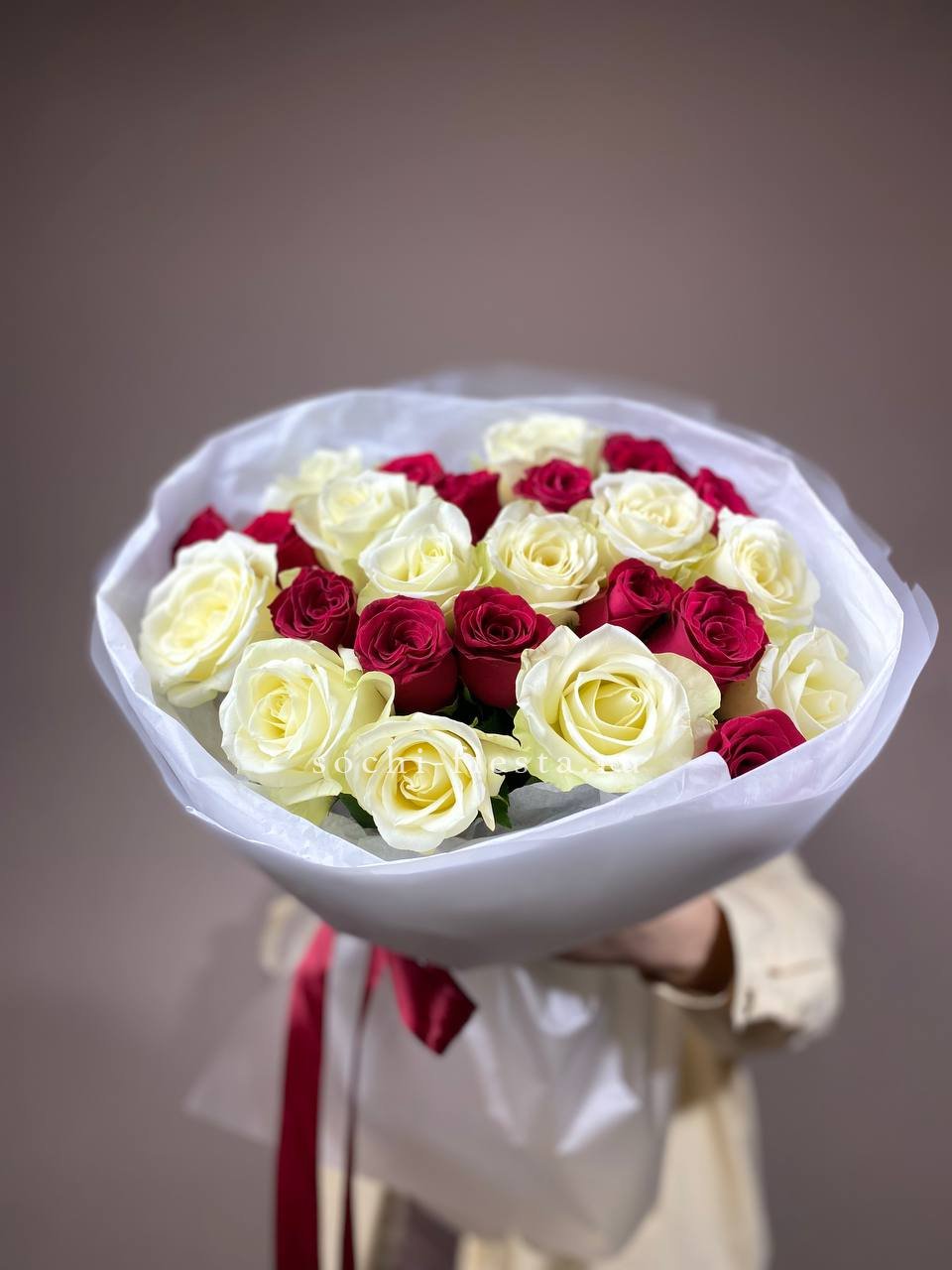 Для заказа товара "Букет их красных и белых 25 роз" с доставкой в Сириусе нажмите в корзину
