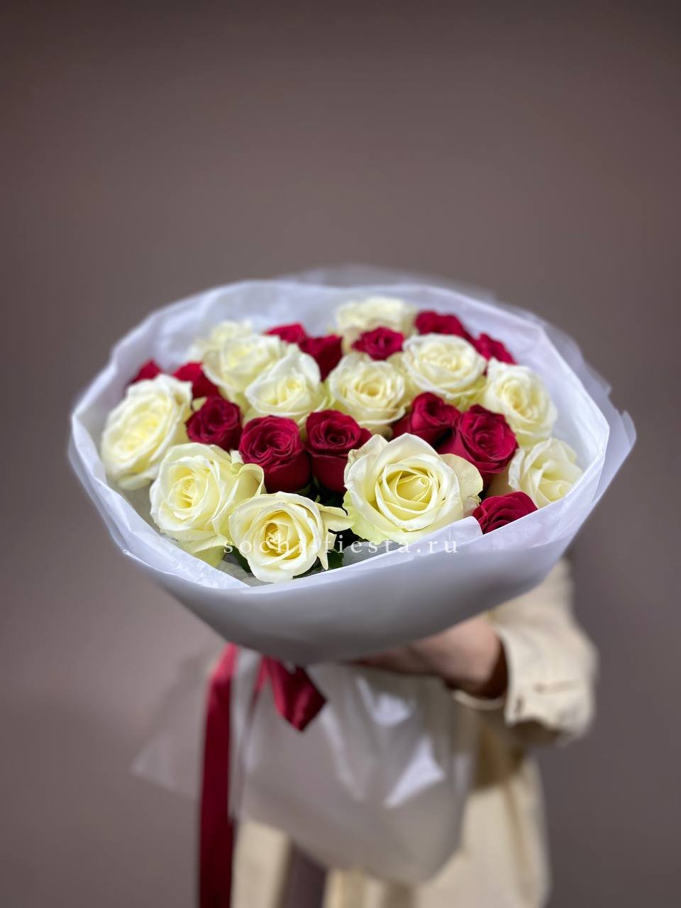 Для заказа товара "Букет из красных белых 35 роз" с доставкой в Сириусе нажмите в корзину
