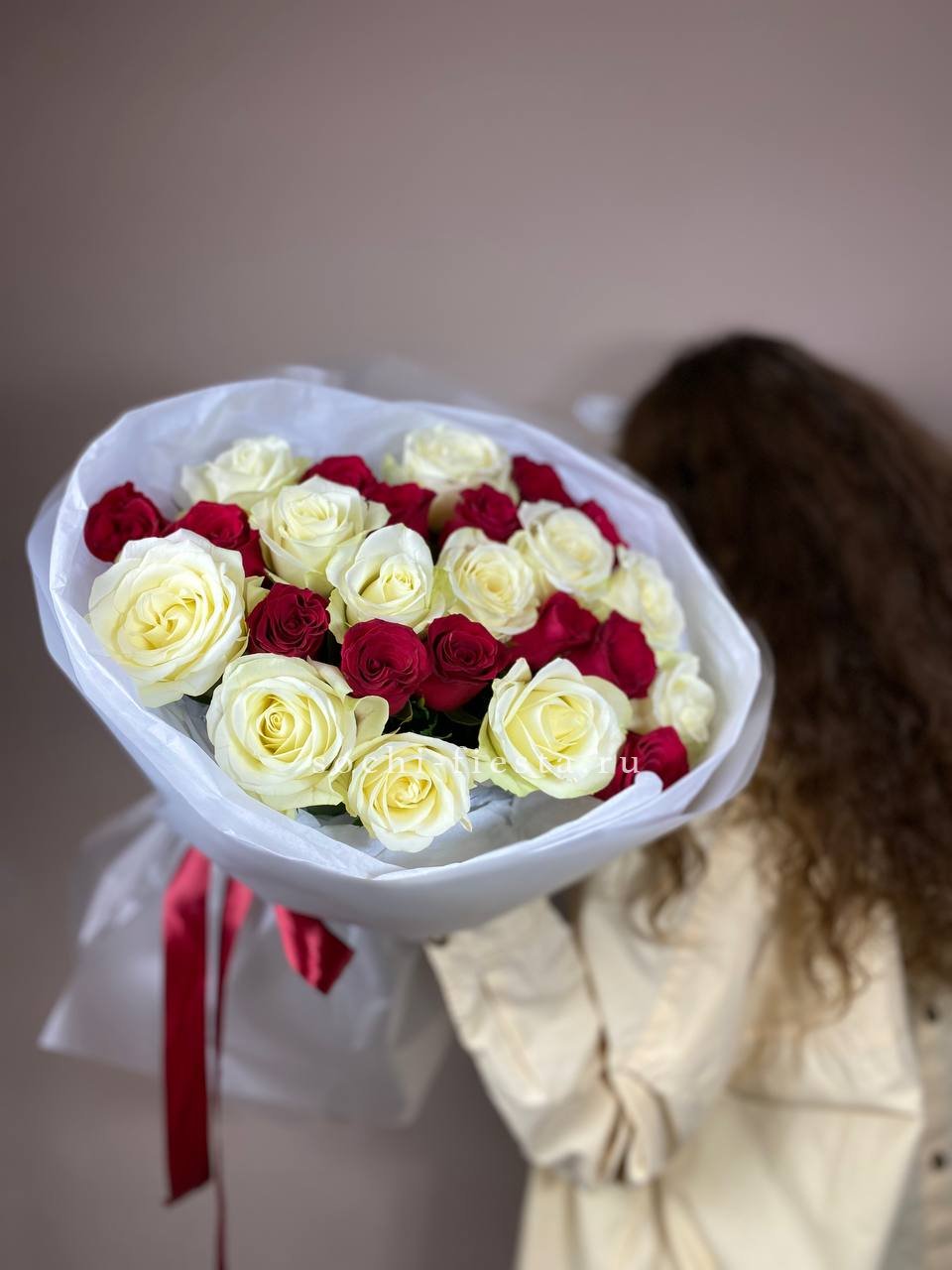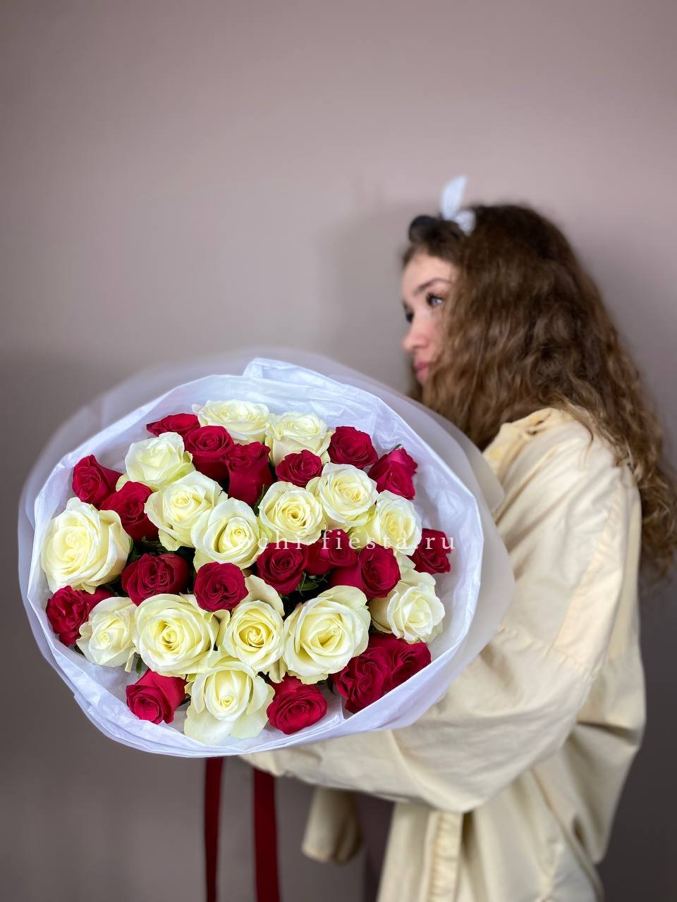 Тридцать пять роз в красно-белой гамме складываются в гармоничную форму с живым ритмом. Бутоны разной степени раскрытия добавляют визуальной глубины всей композиции.