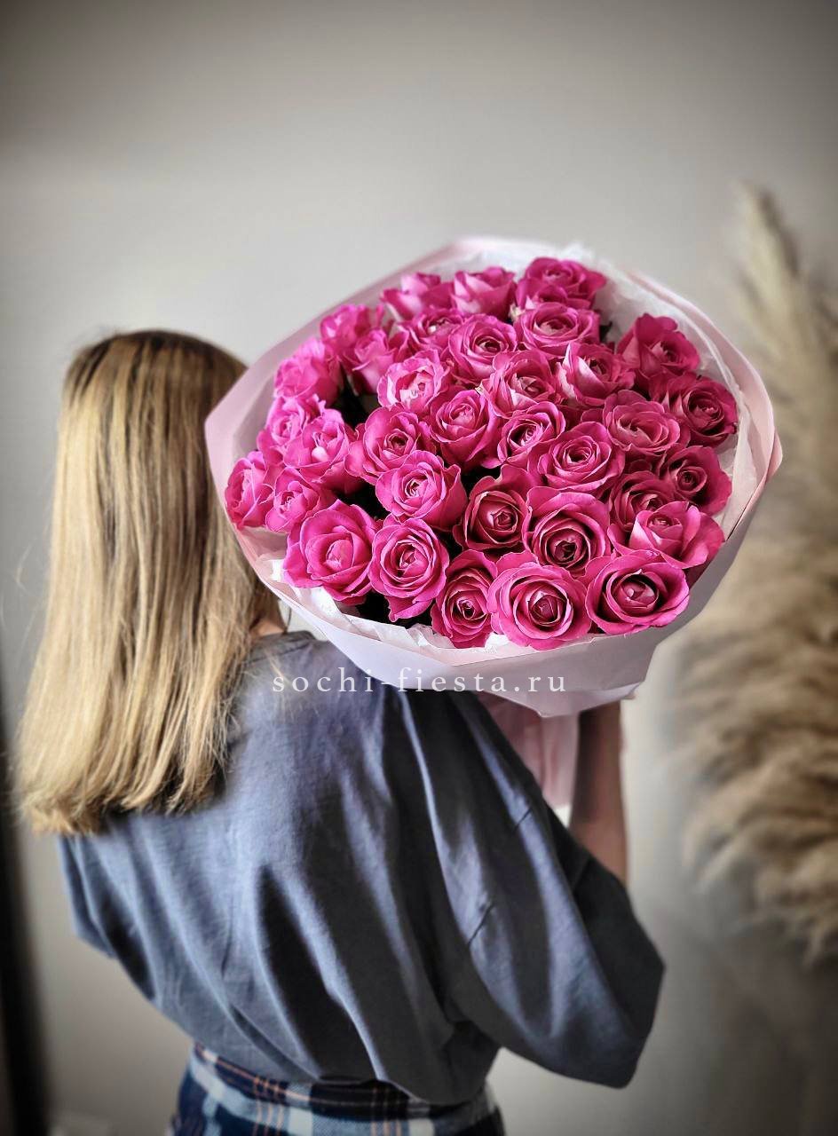 Состав: 35 розовых роз, лента, дизайнерское оформление