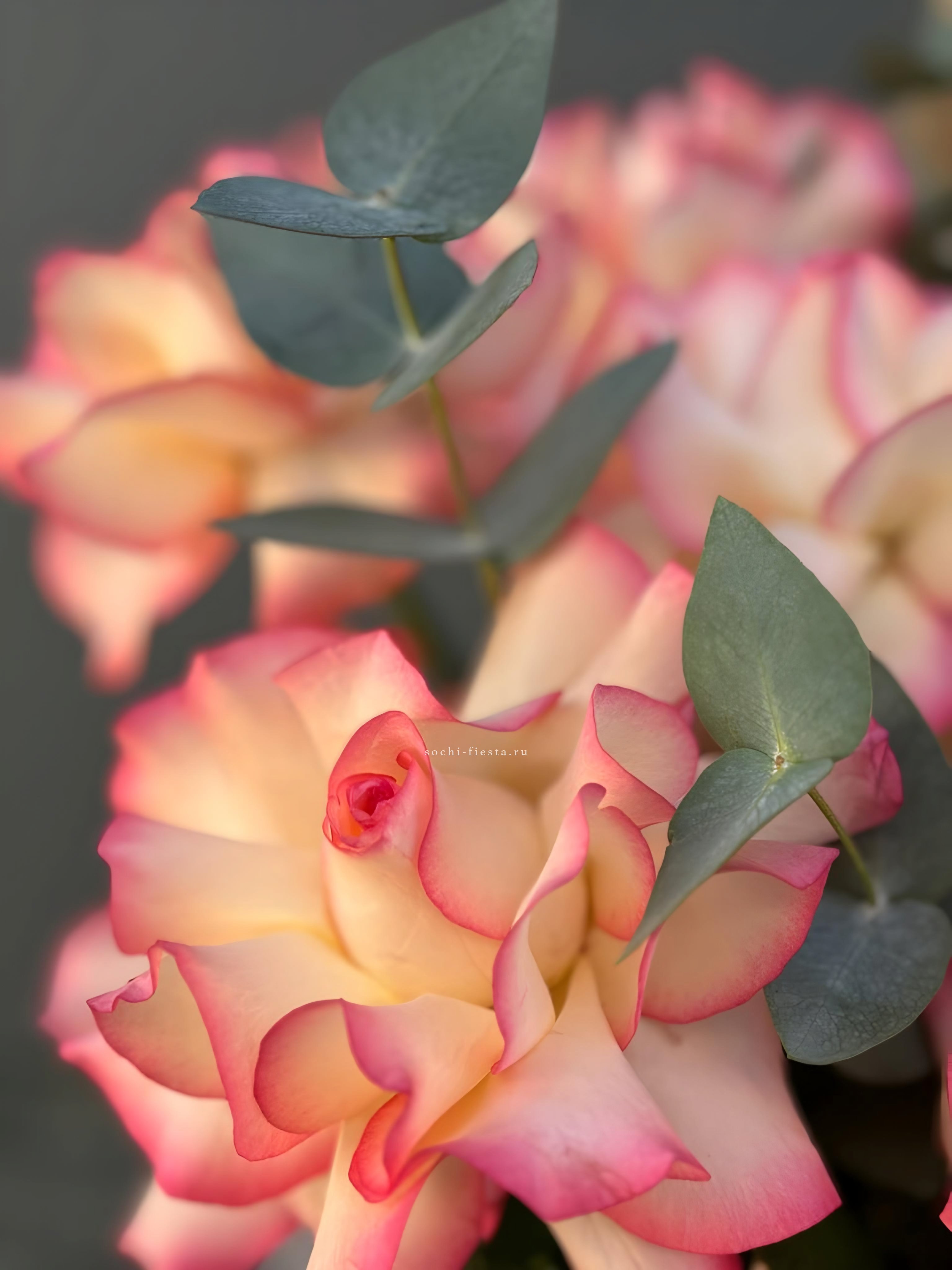 Пятнадцать вывернутых роз Джумилия раскрывают свою многослойную структуру в каждом бутоне. Эвкалипт обрамляет композицию, подчёркивая фактуру лепестков.