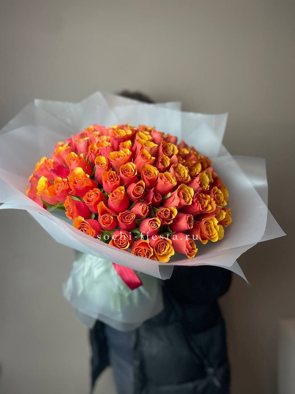 Сто один бутон ярко-алого оттенка собраны в монументальную композицию. Кенийские розы формируют плотную полусферу, где каждый цветок дополняет общий ритм. Это букет, который заполняет пространство цветом и энергией.