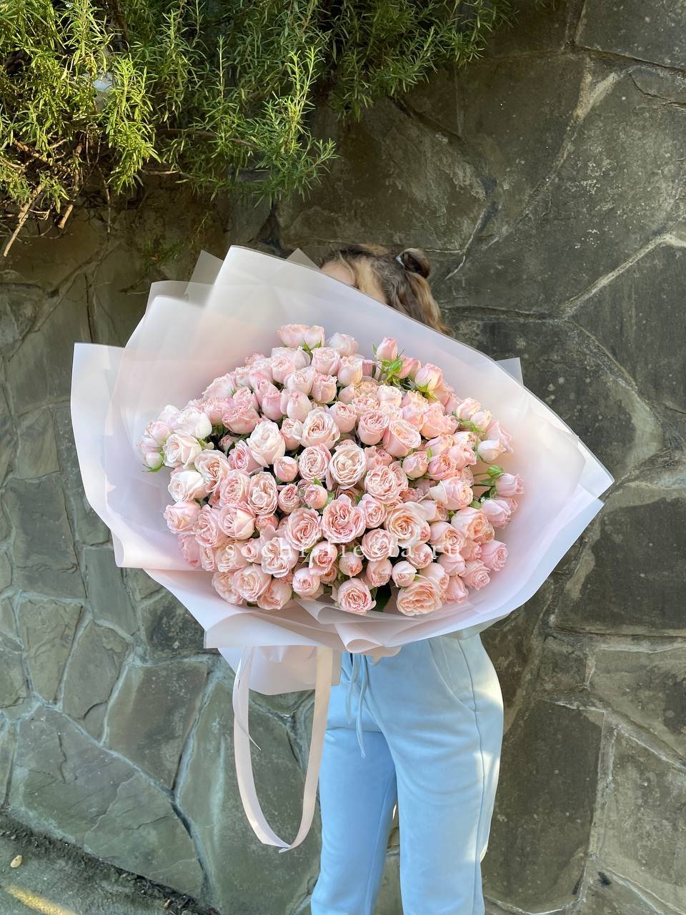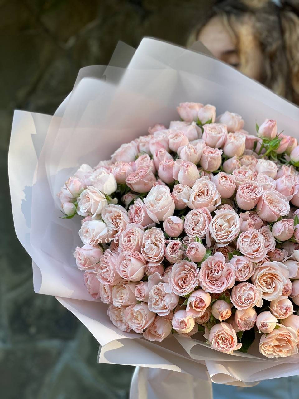 Состав: 45 пионовидных роз Бомбастик нежных оттенков, лента, упаковка.