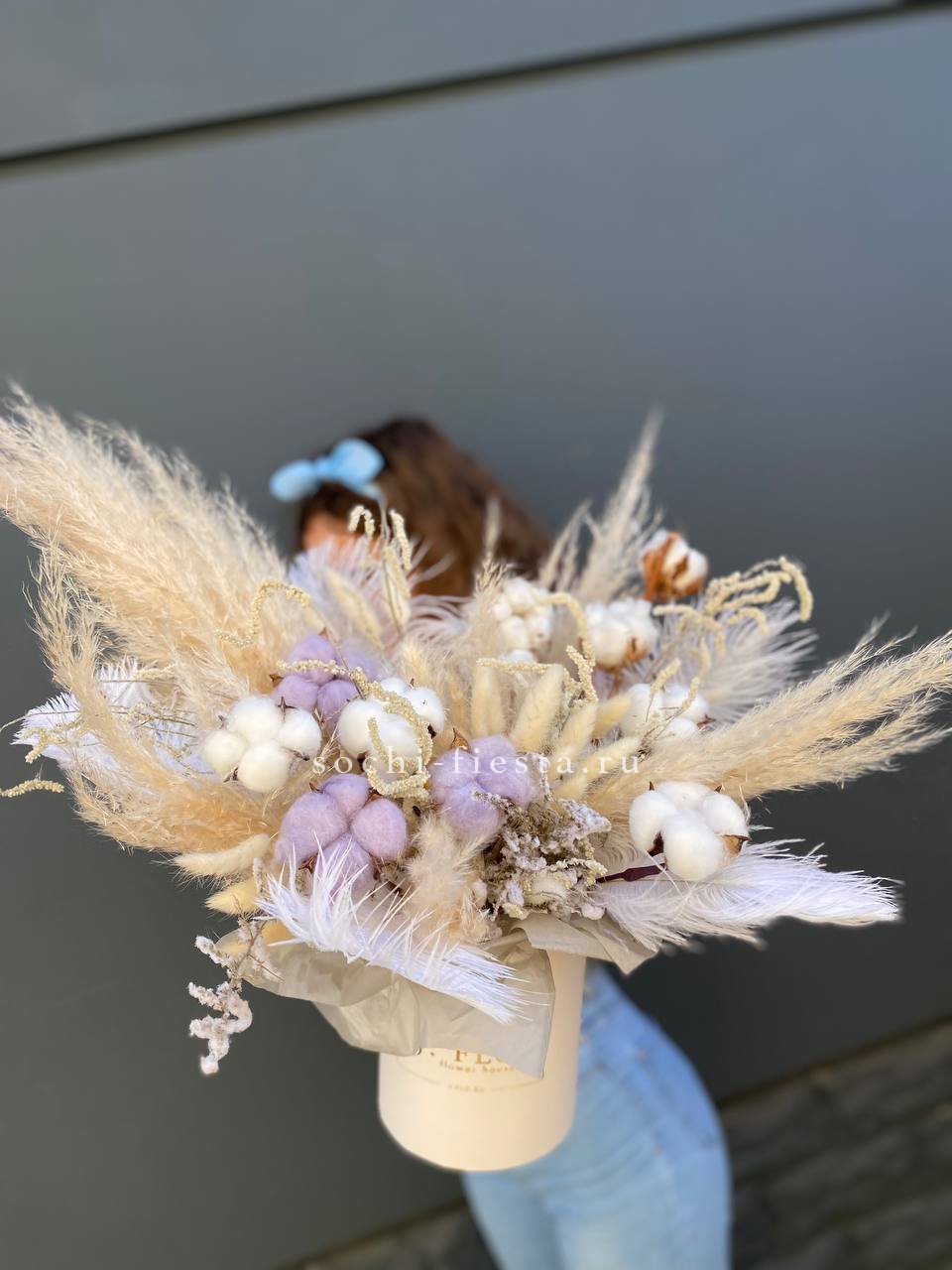 Состав: хлопок, лагурус, амарант, перья, аспарагус, цилиндр D13.