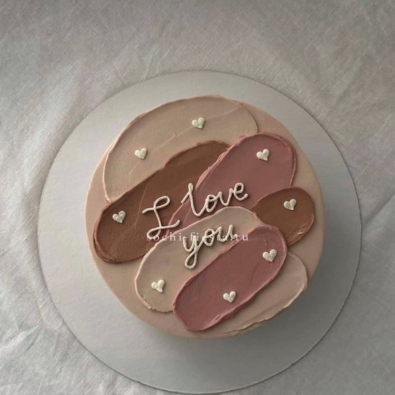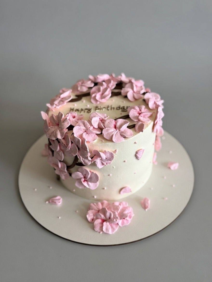 Двухъярусная конструкция с плавным переходом оттенков от пудрового к насыщенному розовому. Гладкая поверхность крема контрастирует с объемными цветочными деталями. Ручная работа с выбором начинки.